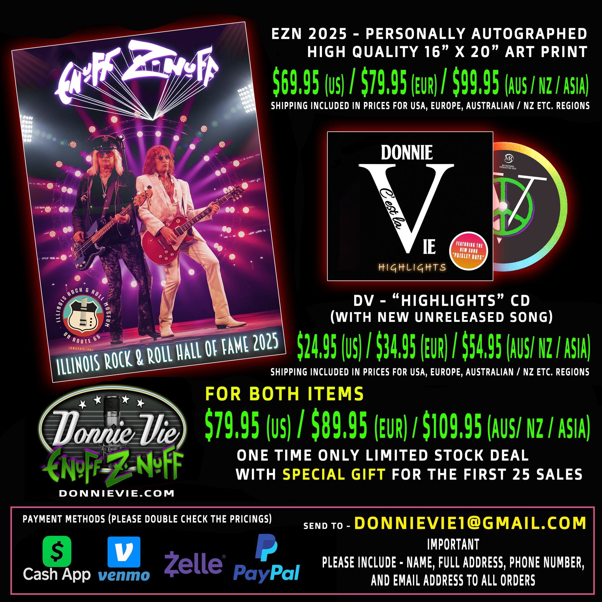 To both celebrate his new release and to raise some money to help promote it fully, and with a nod to his recent health scare, Donnie has embarked upon the 'Back From The Dead Chronicles'. For $100 you can choose your favourite Vie classic, solo or Enuff and Donnie will record a personal version just for you. The catch is each song can only be chosen once and the list is shrinking. Send your money via Paypal through to donnievie1@gmail.com with a list of your 3 to 4 choices in order and Donnie will provide you with the fist avaliable song on your list.
